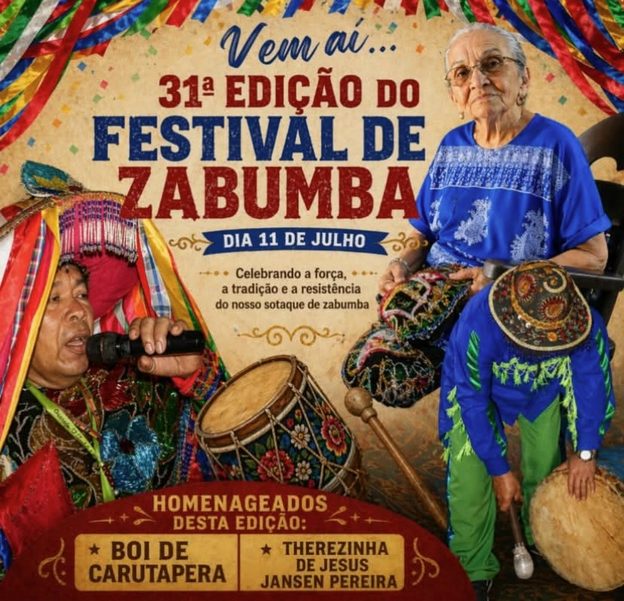 Vem aí a 31ª Edição do Festival de Zabumba! Será no dia 11 de julho, na Av. Newton Bello, no bairro do Monte Castelo, em São Luís, Vamos ver juntos uma noite especial, dedicada à força, à tradição e à resistência do nosso sotaque de zabumba. Durante toda a noite, vários bois de zabumba se apresentam, encantando o público com seus ritmos, cores e histórias.