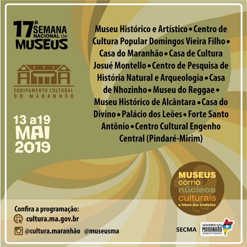 A 17º Semana Nacional de Museus, comemorada em todo o Brasil de 13 a 19 de maio, contará com programação especial realizada pelos museus e casas de cultura do Governo do Maranhão, vinculadas à Secretaria de Estado da Cultura (Secma), além de museus federais, privados e pontos de memória existentes no estado do Maranhão.
