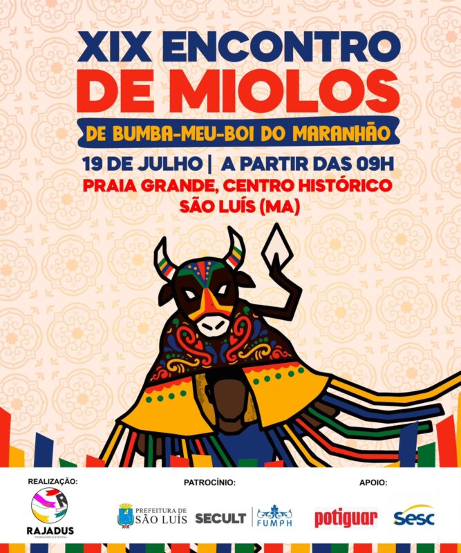O encontro acontece no dia 19 de julho (sexta-feira), a partir das 09 horas, na Praia Grande, Centro Histórico de São Luís. Na programação tem uma linda exposição de carcaças e couros bordados no calçadão da Rua Portugal, um super bate-papo com os miolos de bumba meu boi na sede da Fundação Municipal de Patrimônio Histórico (Fumph), apresentações da Banda de Música do 24° Bis e Banda da Guarda Municipal de São Luís, Cortejo dos miolos pelas ruas da Praia Grande, show com cantadores de bumba meu boi e apresentações do @bumbaboi_mestrebasilio (Zabumba), @boideninaoficial (Orquestra) e @boidemaracana (Matraca).