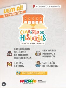 A primeira edição da Feira do Livro Infantil “Convento de Histórias”, projeto que une literatura, arte e cultura em um convite especial ao universo da imaginação, será aberta, neste sábado, 16, e prossegue no domingo, 17 de outubro. Com entrada gratuita, a Feira do Livro Infantil é promovida pelo Governo do Maranhão, por meio da Fundação da Memória Republicana Brasileira (FMRB), em mais uma ação que reafirma o compromisso com a arte, a educação e a cultura maranhense. A iniciativa destaca a importância da literatura infantil na formação de leitores e cidadãos críticos, aproximando as crianças de histórias que dialogam com suas vivências, tradições e identidades.