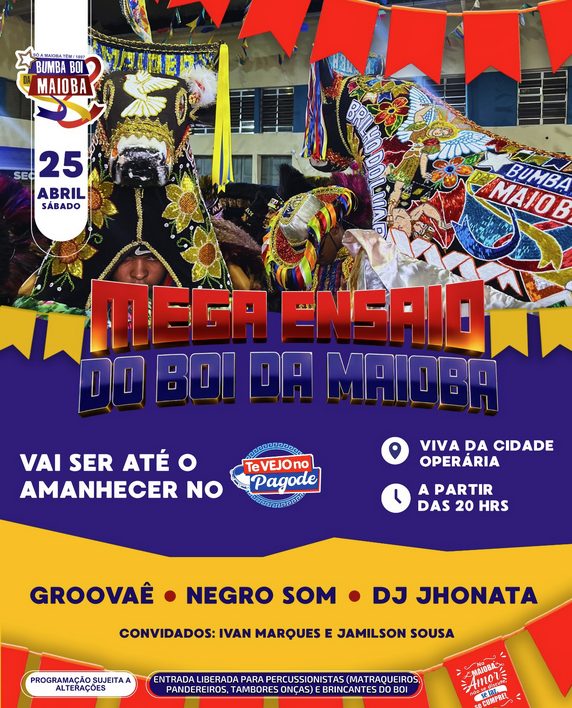 Geral25 de abril tem mais um mega ensaio do Boi da Maioba! E vai até o amanhecer com Groovaê, Negro Som e Dj Jhonata 22/04/202622/04/2026
