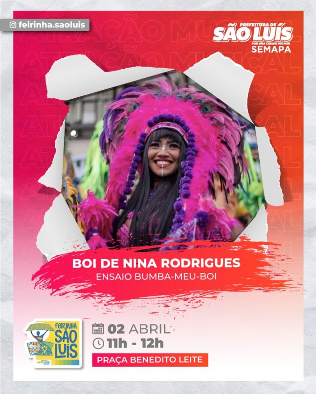 A edição deste domingo (2) da Feirinha São Luís, vai ter ensaio do Bumba-Meu-Boi de Nina Rodrigues, das 11h às 12h na Praça Benedito Leite. Em seguida, tem Taty Pereira, no palco da Benedito Leite das 12:30 às 14h30, com muito forró e MPM.