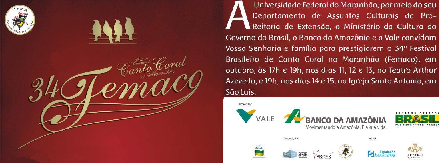 Com patrocínio oficial do Ministério da Cultura (Lei de Incentivo à Cultura), Vale e Banco da Amazônia, o 34º Femaco é uma promoção da Universidade Federal do Maranhão, por meio do Departamento de Assuntos Culturais da Pró-Reitoria de Extensão. Neste ano o festival recebeu apoio cultural da Fundação Sousândrade e do Teatro Arthur Azevedo. O Femaco deste ano acontecerá com programações vespertinas e noturnas, ambas no Teatro Arthur Azevedo e na Igreja Santo Antonio.