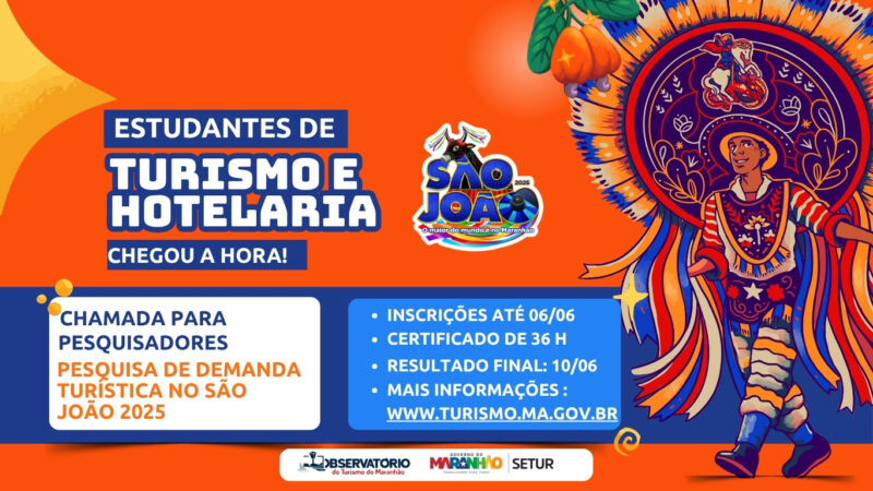 A Secretaria de Estado do Turismo do Maranhão (Setur-MA) abriu as inscrições para o credenciamento de Pesquisador Júnior com a finalidade de compor a equipe de coleta de dados do São João do Maranhão 2025. A iniciativa, realizada em parceria com o Observatório do Turismo do Maranhão (Obstur-MA), busca estudantes de graduação e cursos técnicos da área de turismo e hotelaria, ou áreas afins, interessados em colaborar na Pesquisa de Demanda Turística que traça o perfil e a satisfação dos visitantes dos festejos juninos.