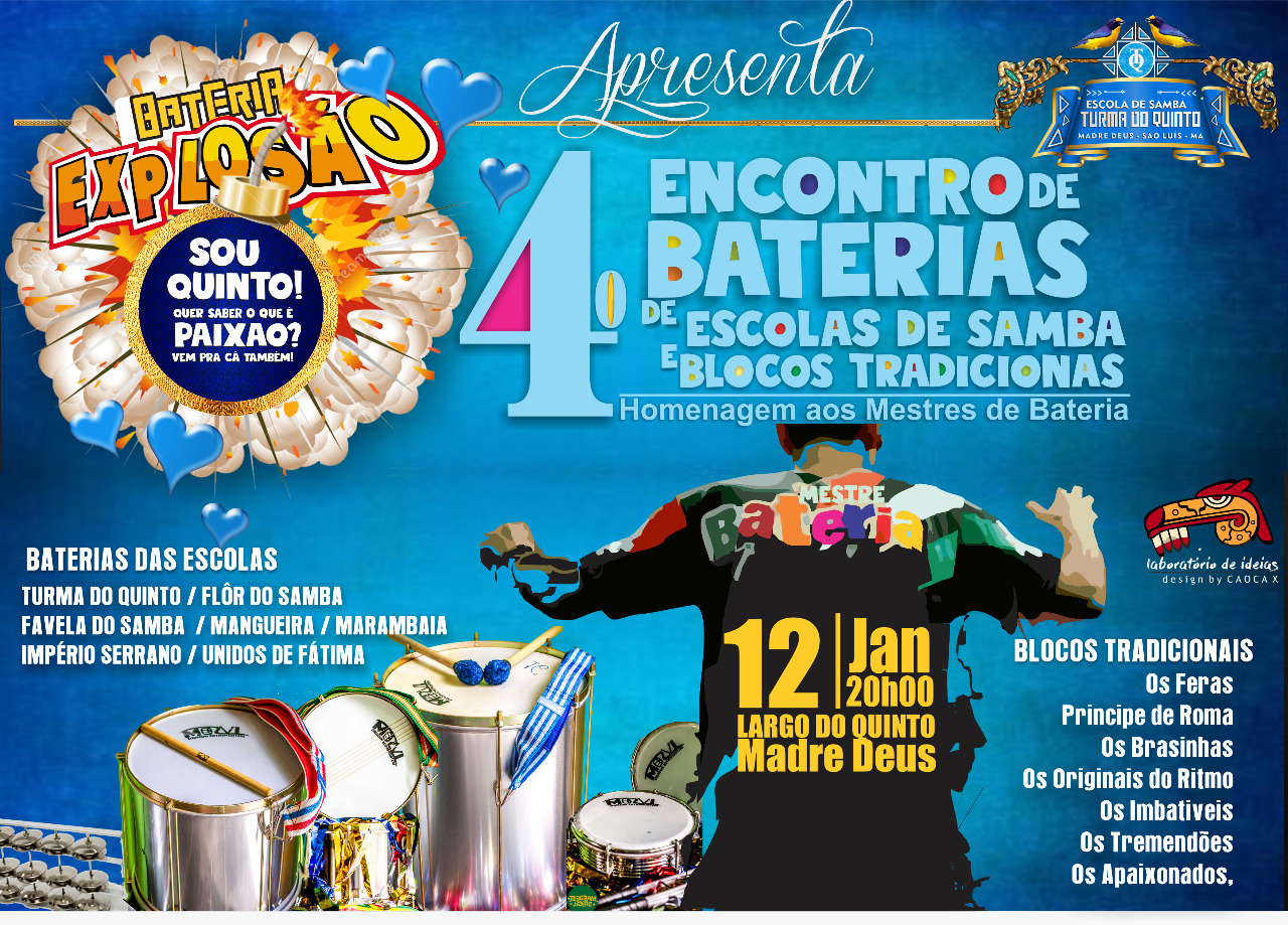 O 4º Encontro de Baterias promovido pela Turma do Quinto está agendado para acontecer nesta sexta-feira, dia 12 de janeiro, em frente à sede o Quinto, localizado na Rua do Norte, a partir das 19 horas.