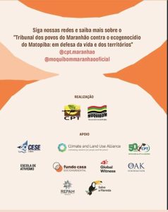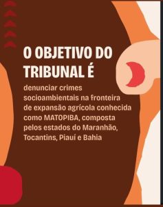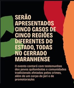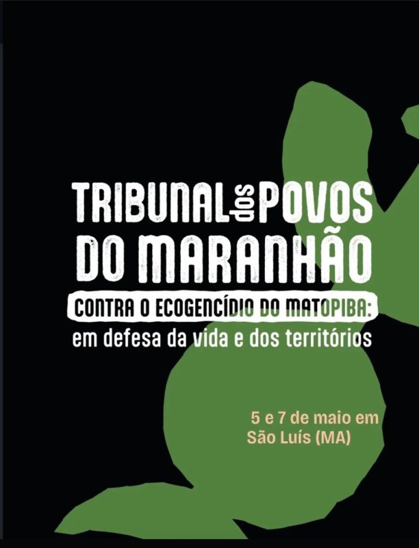 Entre os dias 5 e 7 de maio, a cidade de São Luís (MA) será sede do “Tribunal dos Povos do Maranhão contra o ecogenocídio do Matopiba: em defesa da vida e dos territórios”. O objetivo do tribunal é ser um instrumento de escuta, denúncia e incidência política em casos de crimes de ecogenocídio cometidos por governos e empresas do agronegócio na fronteira de expansão agrícola conhecida como MATOPIBA, formada pelos estados do Maranhão, Tocantins, Piauí e Bahia. O evento contará com testemunhas dos povosquilombolas e comunidades tradicionais afetadas pelos crimes, além de um corpo de júri e de promotores formados por pessoas de diferentes áreas da sociedade civil.