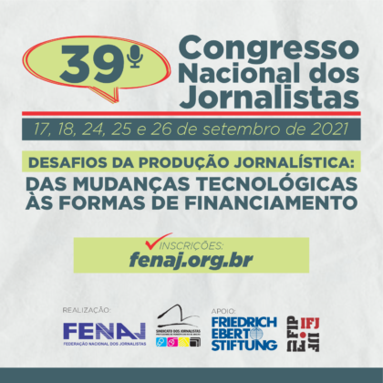 Estão abertas as inscrições para o 39º Congresso Nacional dos Jornalistas, que acontecerá nos dias 17, 18, 24, 25 e 26 de setembro deste ano, em plataforma digital. Com o tema “Desafios da produção jornalística: das mudanças tecnológicas às formas de financiamento”, o evento é realizado pela Federação Nacional dos Jornalistas (FENAJ), em parceria com o Sindicato dos Jornalistas Profissionais do Município do Rio de Janeiro (SJPMRJ), com o apoio da Fundação Friedrich Ebert (FES) e da Federação Internacional dos Jornalistas (FIJ).
