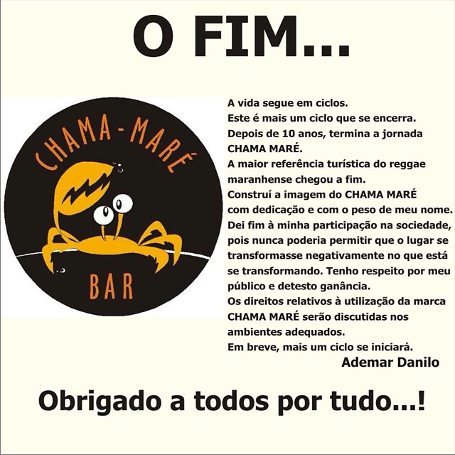 O produtor musical e apresentador Ademar Danilo anunciou hoje (12) o fim do “Chama Maré”, casa dedicada ao reggae localizada na Ponta d’Areia.