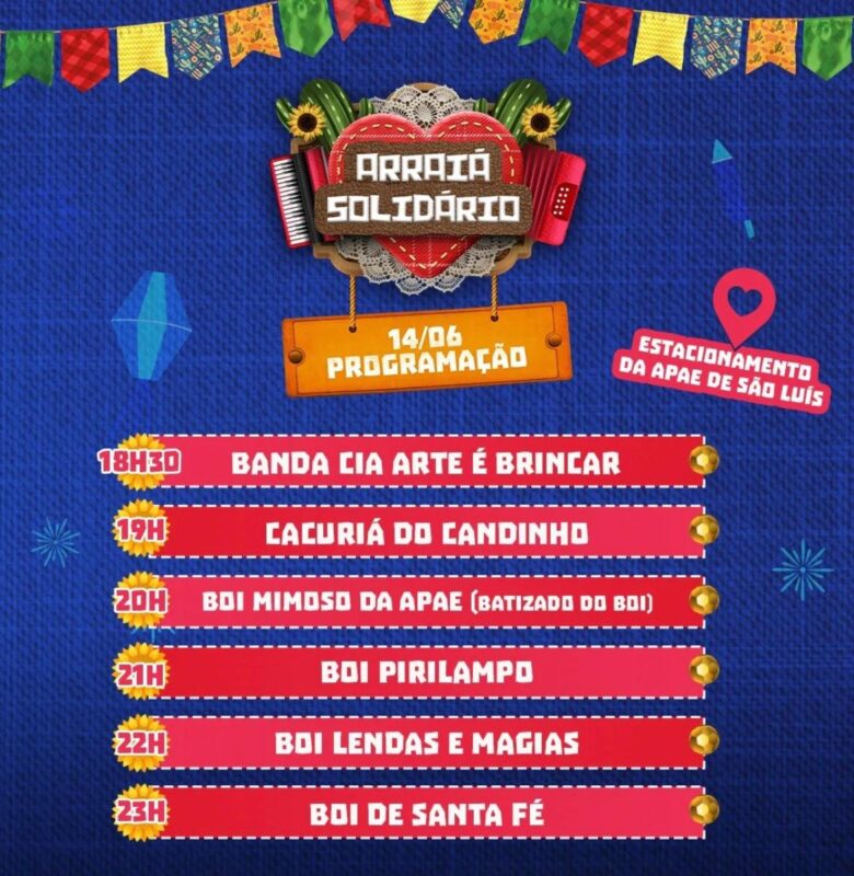 A APAE de São Luís realiza, no dia 14 de junho (sábado), a partir das 18h, o Arraiá Solidário 2025, no estacionamento da instituição, localizado na Avenida Granja Barreto, nº 1, Outeiro da Cruz.