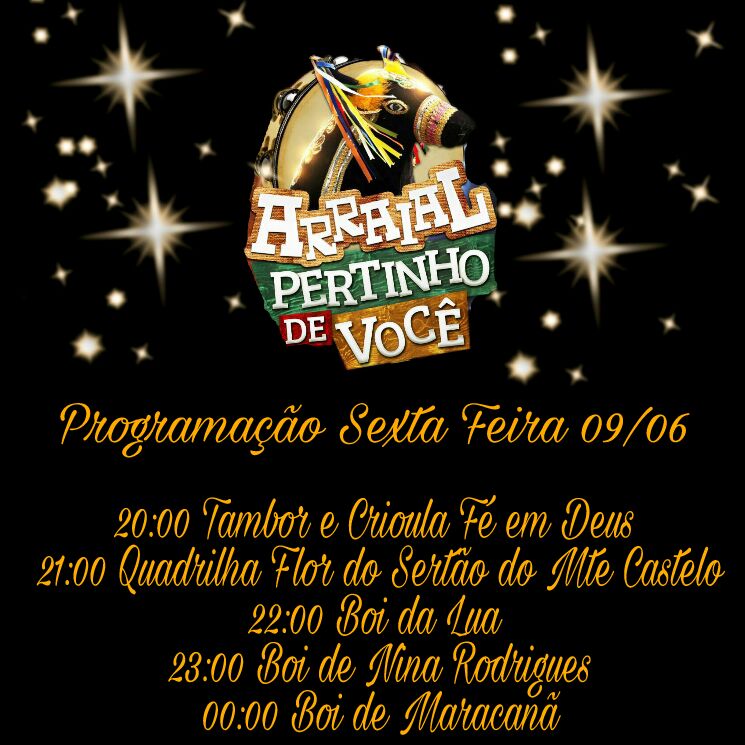 Neste final de semana, oferece, uma variedade de atrações, sempre com entrada franca. Logo na sexta-feira (9), as apresentações têm início a partir das 20h, com o Tambor de Crioula da Fé em Deus, seguido da Quadrilha Flor do Sertão do Monte Castelo, que entrará no palco às 21 horas. O Boi da Lua mostrará seus encantos às 22 horas, enquanto as sensuais índias do Boi de Nina Rodrigues estarão em cena às 23 horas. O poderoso batalhão do Boi do Maracanã se apresentará à 0h.