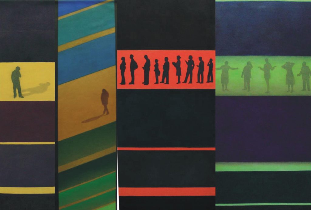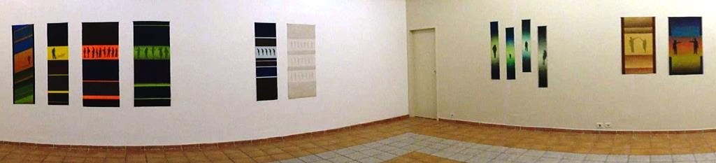 A escolha dos desenhos das figuras humanas foi inspirada na iconografia digital, no ‘Banco de imagens//pessoas.com’, de domínio público da internet, que são imagens vetoriais, algumas livres de direitos autorais”, disse Marie-Ange Giaquinto. “As imagens de pessoas.com são inseridas em outro espaço, o pictórico onde procura-se criar uma sincronia entre a anatomia humana e o movimento do desenho na composição geométrica”, acrescentou a artista.