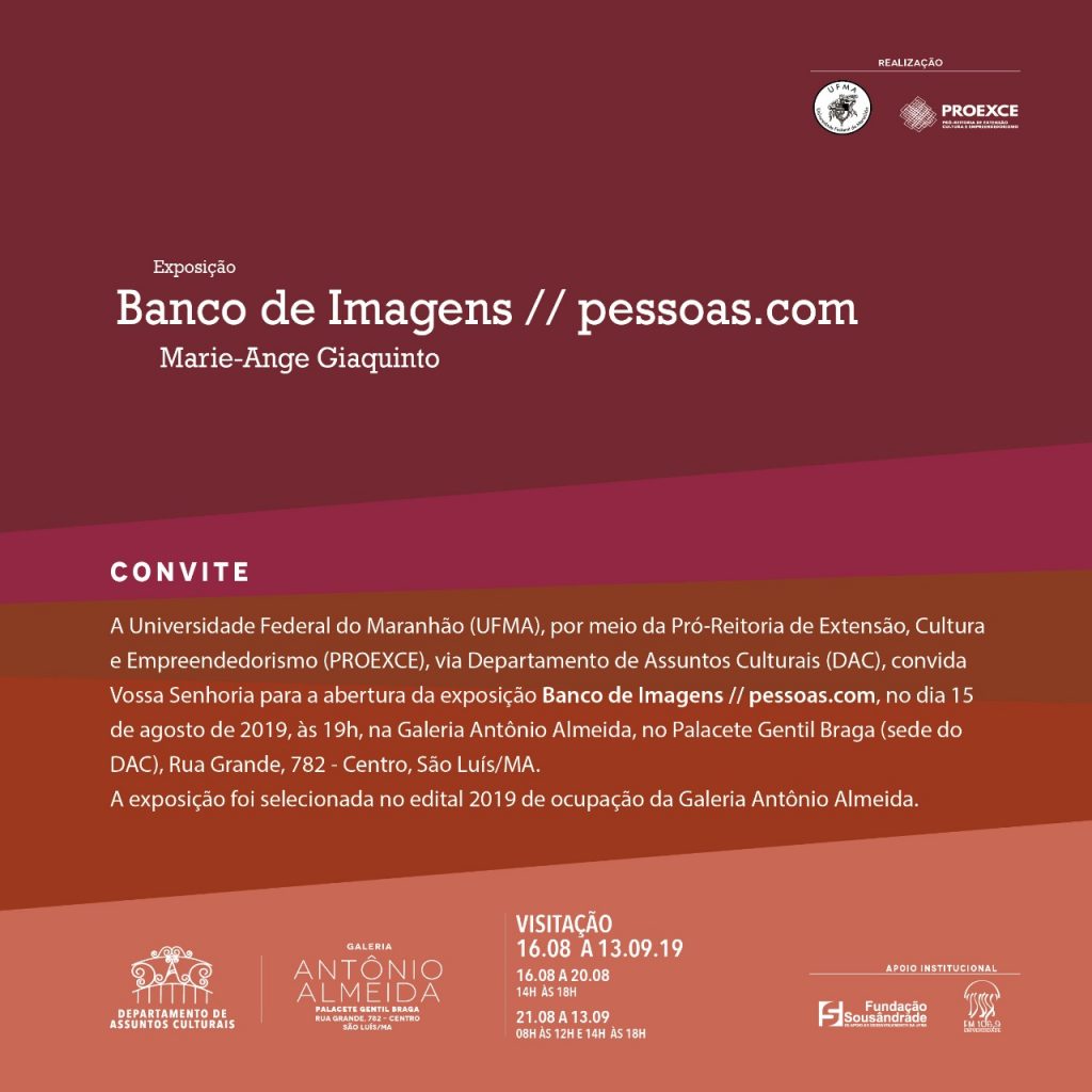 A Universidade Federal do Maranhão (Ufma) convida o público, artistas, curadores e produtores e estudantes de artes para a abertura da exposição internacional ‘Banco de Imagens//pessoas.com’, da artista visual Marie-Ange Giaquinto. Com entrada gratuita, a mostra será inaugurada na quinta-feira, 15 de agosto, às 19h, na Galeria Antônio Almeida, no Palacete Gentil Braga (rua Grande, 782, Centro), em São Luís (MA).