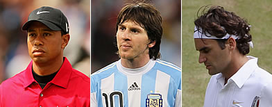 Bem atrás vem o tenista suíço Roger Federer, com US$ 61.768.110,00, seguido por outro golfista americano, Phil Mickelson (US$ 61.660.757,00). Depois do boxeador Floyd Mayweather Jr. e do astro da NBA LeBron James, aparece um trio de boleiros: Lionel Messi (US$ 44 milhões), David Beckham (US$ 40.500.000,00) e Cristiano Ronaldo (US$ 40.000.000,00).