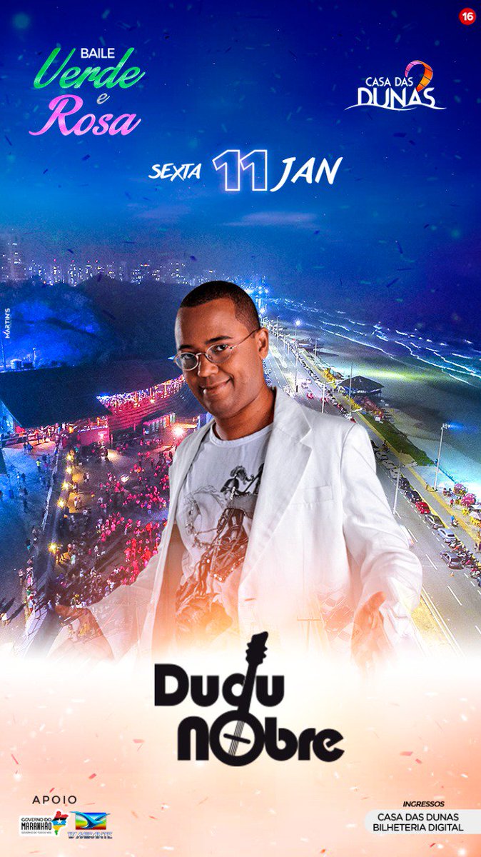 Cantor Dudu Nobre aterrissa em São Luís hoje como atração principal do Baile Verde e Rosa, às 21h, na Casa das Dunas, na Avenida Litorânea, com a participação de Argumento, Blocão do Nina, Feijoada Completa e Bateria da Mangueira.