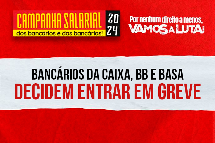 Greve Geral – Os bancários da Caixa, BB e BASA decidiram deflagrar greve nacional a partir do dia 10 de setembro, após rejeitarem a proposta dos bancos de reajuste de 4,64% (INPC + 0,7%) nas verbas salariais em 2024 e de 0,6% (mais a inflação) em 2025. Os funcionários cobram 34,47% de aumento, entre outras reivindicações.