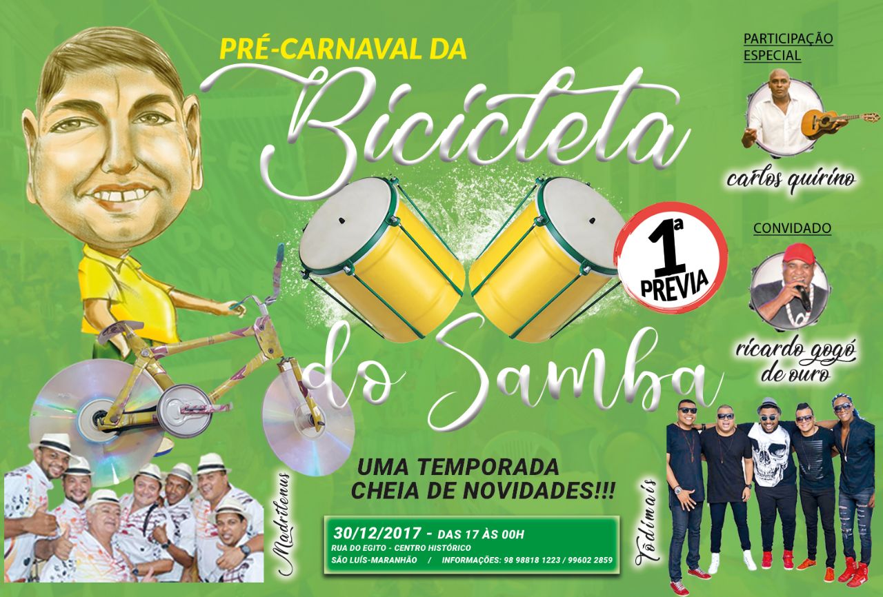 O rei mandou cair dentro da folia!!! E, atendendo aos pedidos da majestade, a Bicicleta do Samba põe seu bloco na rua e começa sua temporada 2018. A tarde/noite de abertura acontece no penúltimo dia do ano de 2017, com uma festa que homenageará o samba, na Rua do Egito, tradicional circuito do pré-carnaval de São Luís. Um projeto de música que, ao longo de cinco semanas, levará para a tenda armada no centro da arena, que será montada entre as duas extremidades, os mais renomados grupos e artistas do ritmo na capital maranhense.