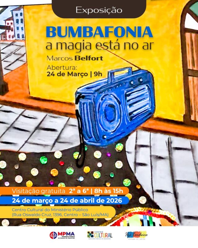 Bumbafonia: a magia está no ar. Esta é a primeira exposição de Marcos Belfort no Centro Cultural do Ministério Público, composta por 28 obras, entre pinturas e esculturas feitas a partir da reciclagem de materiais.