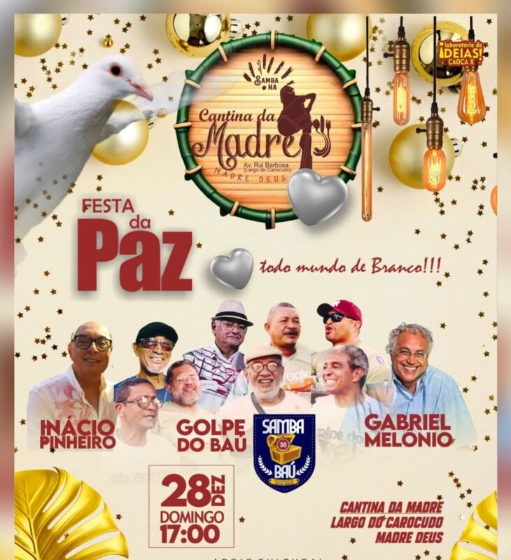 Cantina da Madre orgulhosamente apresenta: Festa da Paz, com Inácio Pinheiro, Golpe do Baú e Gabriel Melônio. É neste domingo, 28 de dezembro, às 17h, no Largo do Caroçudo, na Madre Deus. Traje rigorosamente BRANCO!