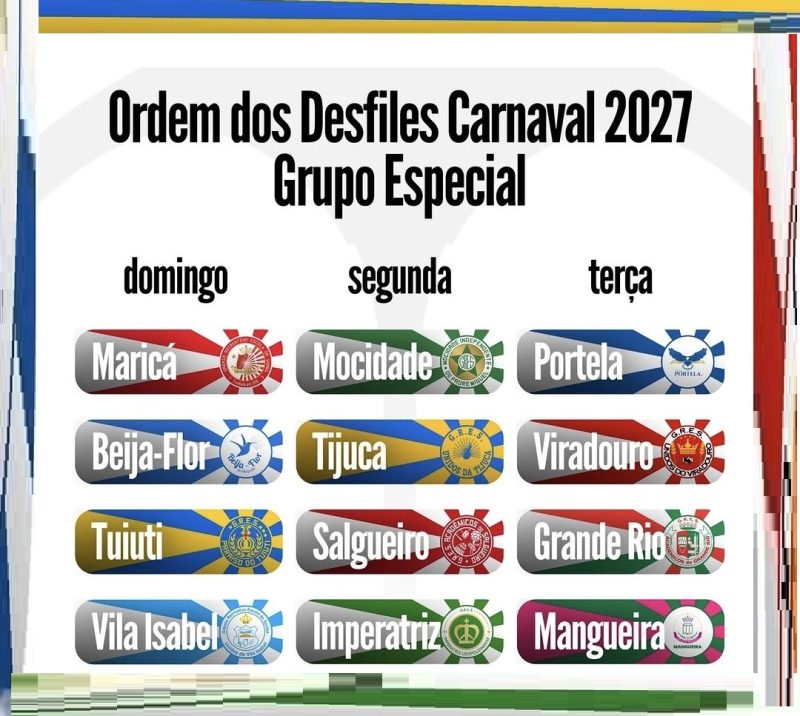 RIO DE JANEIRO – O Rio de Janeiro já definiu a ordem dos desfiles das escolas de samba do Grupo Especial para o carnaval de 2027. O sorteio organizado pela Liga Independente das Escolas de Samba (Liesa), que definiu a entrada de cada agremiação na Marquês de Sapucaí, ocorreu na última quinta-feira (16).