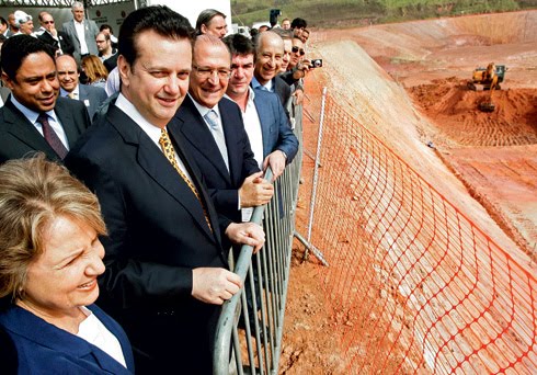 Sanchez ao lado de Alckmin e de Kassab na abertura das obras do Itaquerão