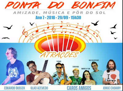 Neste ano, o “Ponta do Bonfim: amizade, música e pôr do sol” irão se apresentar artista que enaltecem a legitima e refinada alma musical nacional: Eduardo Duseek, Glad Azevedo e “Quarteto Caros Amigos” (composto por Marconi Rezende, Tutuca, Gabriela Flor e Chico Neis), além da discotecagem do DJ Jorge Choairy.