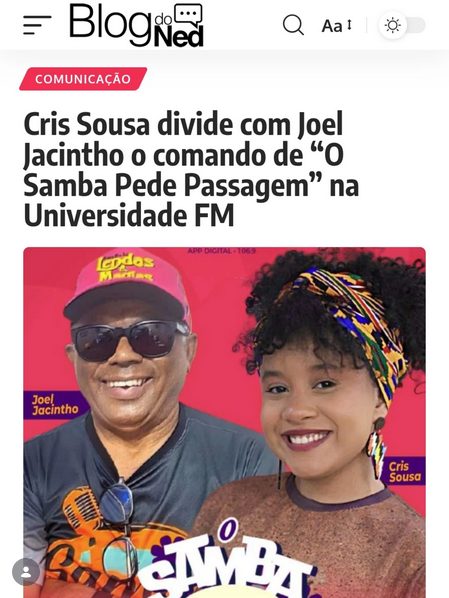 O irreverente e destemido programa “O Samba Pede Passagem”, da Rádio Universidade FM (106,9 MHz), continua, neste sábado, em mais uma edição da nova fase de sua trajetória de sucesso. Agora com o reforço da radialista e pesquisadora Cris Sousa, que passa a dividir o comando da atração com o experiente jornalista e ativista cultural Joel Jacintho, o programa, exibido todos os sábados, das 12h às 14h, foi consagrado pelos ouvintes e internautas como um dos pilares da cultura popular no rádio maranhense.