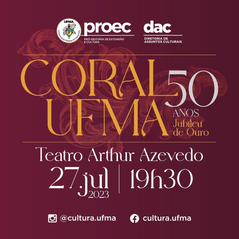 “Coral UFMA – Uma História Contada e Cantada’’ é o tema do aniversário de 50 anos do Coral da Universidade Federal do Maranhão. O concerto de celebração será realizado no dia 27 de julho (quinta-feira), às 19h30, no Teatro Arthur Azevedo. A retirada de ingressos começará às 13h30, no dia do evento, na bilheteria do teatro. Cada pessoa poderá retirar dois bilhetes e 420 lugares estarão disponíveis para o público. A programação é gratuita.