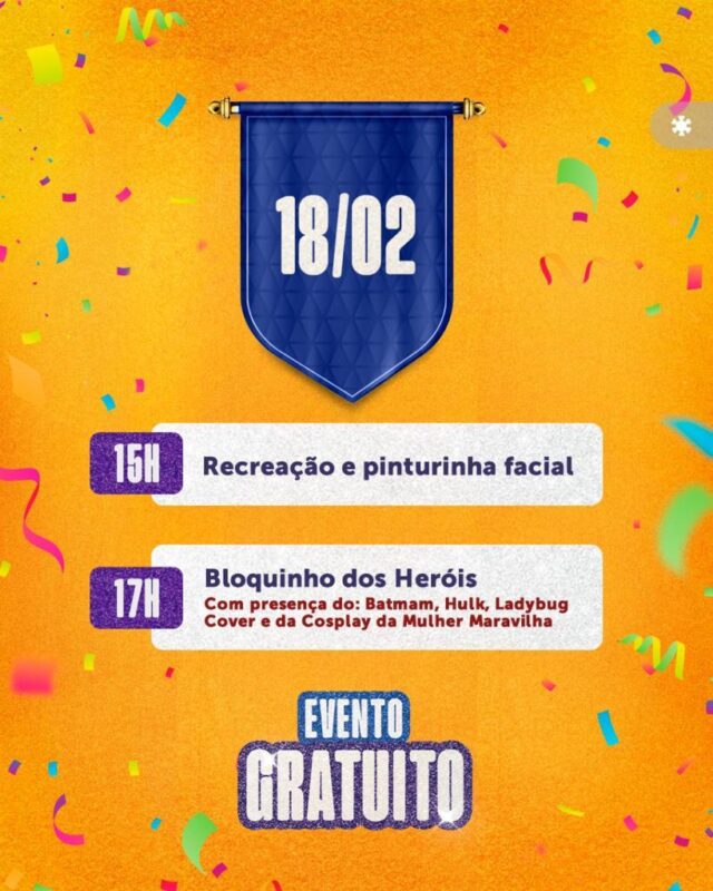 Confira a programação para você cair na folia em família com conforto e segurança: no dia 18/02 – 15h – Recreação e Pinturinha facial;  17h – Bloquinho dos Heróis com a presença do Batman, Hulk, LadyBug Covers e da Cosplay da Mulher-Maravilha.