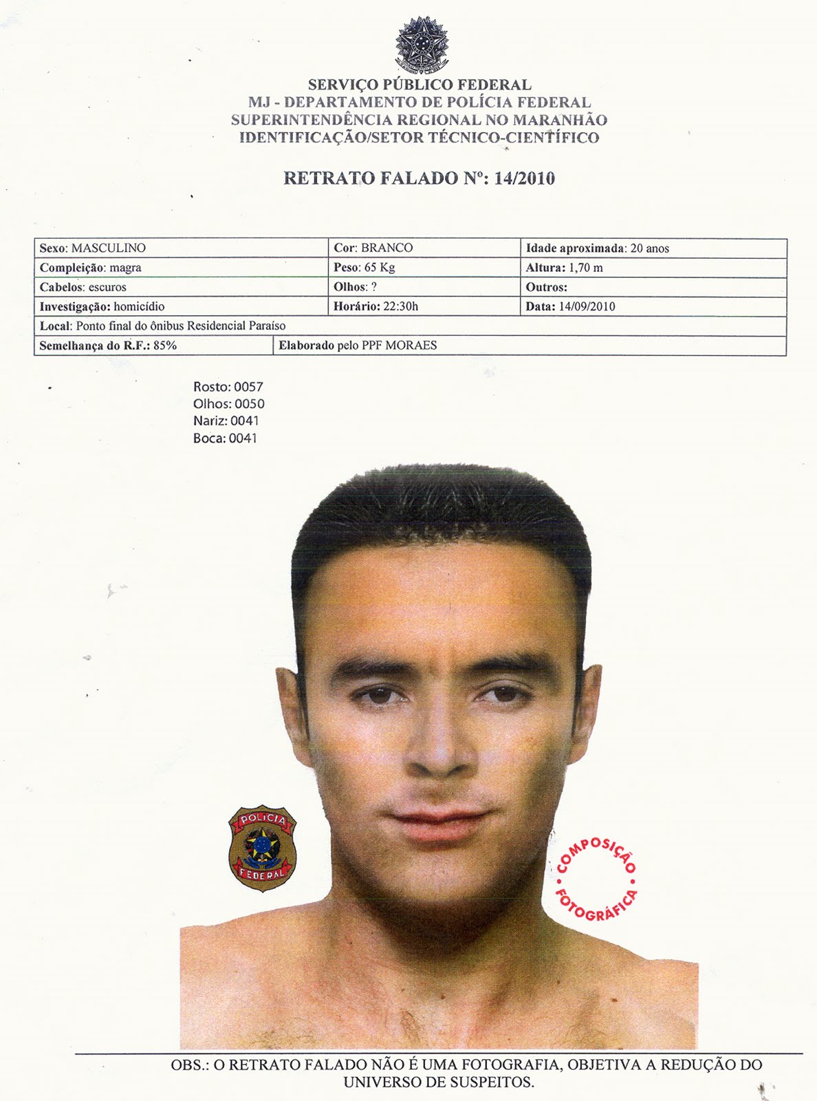 Para ajudar na confecção do retrato falado, a SSP-MA firmou uma parceria com a Superintendência da Polícia Federal no Maranhão, que utilizou um programa especializado em criar rostos de foragidos da Justiça.