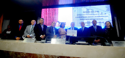 “Damos honra a quem tem honra”, assim foi saudada a desembargadora Ângela Maria Salazar pelo vereador Josué Pinheiro (PSDB) na sessão solene da Câmara de Vereadores de São Luís, na tarde desta terça-feira, em que ela foi agraciada com o título de cidadã ludovicense pelos serviços prestados à cidade como delegada, promotora e magistrada. A honraria, proposta pelo vereador, contou com a aprovação unânime dos representantes do povo na Casa.