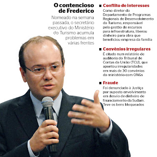 Frederico Costa está no Ministério do Turismo desde 2003, ano de criação da pasta. Depois de passar por vários departamentos, ele assumiu a chefia da Secretaria Nacional de Programas de Desenvolvimento do Turismo, posto que ocupava quando foi firmado o convênio com o Ibrasi, objeto de investigação pela polícia e que resultou nas prisões de hoje. No início deste ano, tornou-se secretário executivo.