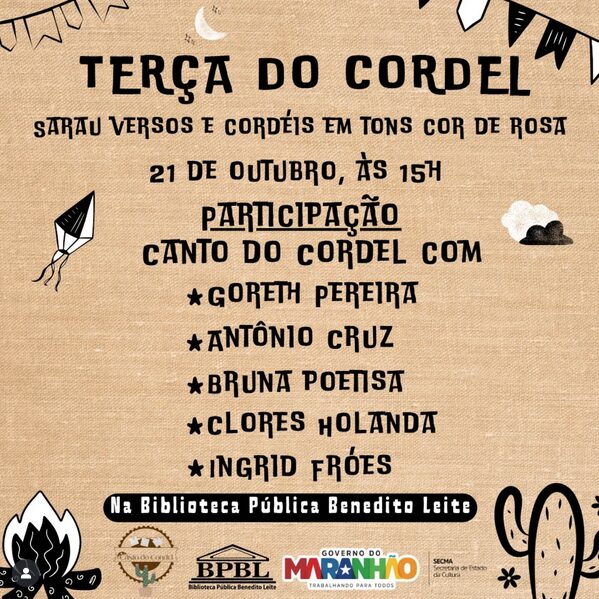 Obs. A Terça do Cordel é uma atividade gratuita e aberta ao público, reafirmando o compromisso da Biblioteca Pública Benedito Leite com a promoção da cultura popular, da leitura e da poesia.