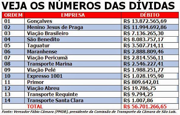 O levantamento produzido pelo presidente da Comissão de Transporte apurou que a dívida total das empresas com o poder público municipal ultrapassa os R$ 56 milhões. O débito mais alto é da Gonçalves, com R$ 13,8 milhões reconhecido pela Fazenda. E o mais baixo é da Santa Clara, com pouco mais de R$ 1 mil reais.