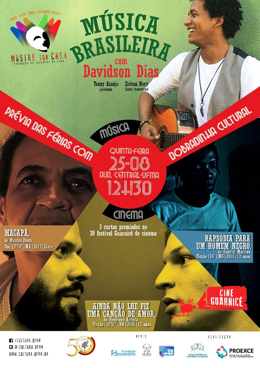 A prévia das férias dos estudantes da Universidade Federal do Maranhão (Ufma) terá uma dobradinha cultural. As atrações dos projetos Mostre Sua Cara e Cine Guarnicê desta quinta-feira (25), às 12h30, no Auditório Central da Cidade Universitária Dom Delgado serão o show “Música Brasileira”, com o cantor e compositor Davidson Dias, e a exibição de curtas premiados no 39º Festival Guarnicê de Cinema, O evento tem o selo comemorativo dos 50 anos da Ufma.