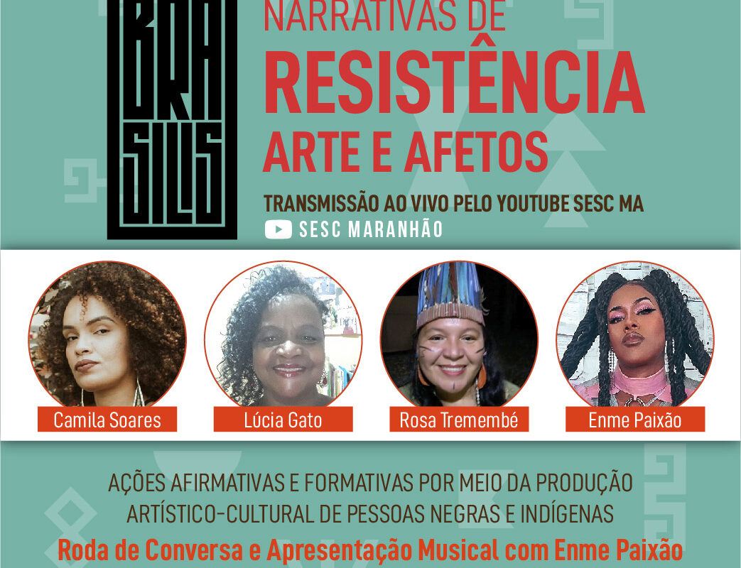Dar maior visibilidade às discussões sobre a ampliação da representatividade de negros e indígenas no Brasil e contribuir para criações de redes entre artistas, criadores, produtores e agentes culturais, é o que propõe o Sesc na Roda de Conversa “Narrativas de resistência, arte e afetos”. O evento conta com a participação de Enme, Lúcia Gato, Rosa Tremembé (Tüny Cwe Wazahi) e tem mediação de Camila Soares. Realizado no Teatro Sesc, toda programação será transmitida ao vivo no Youtube Sesc Maranhão neste sábado(5), às 17h.