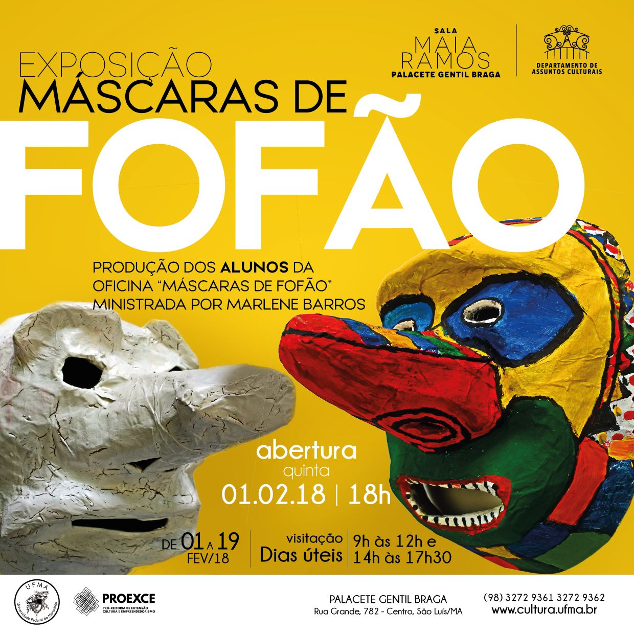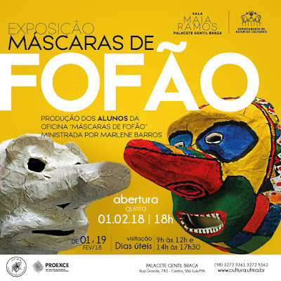 A exposição temática ‘Máscaras de Fofão’ será aberta nesta quinta-feira (01), às 18h, na Sala Maia Ramos do Palacete Gentil Braga (rua Grande, 782-Centro), em São Luís (MA). A mostra temática reúne 50 máscaras de fofão, personagem mais popular das tradições do carnaval de rua do Estado do Maranhão. As peças foram produzidas pelos alunos da oficina ‘Máscaras de Fofão’, ministrada em janeiro, no próprio Palacete, pela artista visual Marlene Barros. Informações: www.cultura.ufma.br, 98 3272 9361 e 3272 9362.