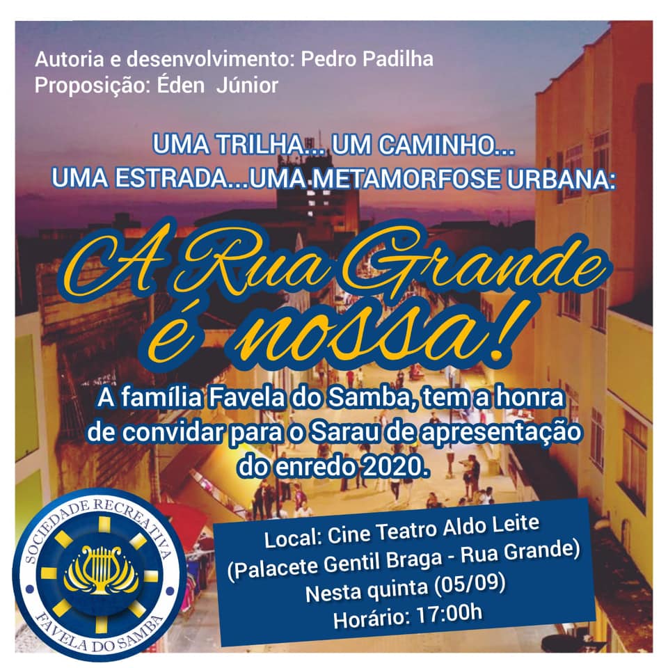 A Sociedade Recreativa Favela do Samba, apresentou na última  quinta-feira (5),  seu enredo para o carnaval de 2020. O evento  contou com a apresentação da bateria da escola, sob o comando do mestre Júlio Diniz, e mais a diretoria da escola, carnavalescos, convidados, e as performances dos artistas Uimar Junior e Josimael Caldas, e a exibição do filme “Maria vai ao Cinema”. O evento foi realizado no Cine Teatro Aldo Leite, localizado no Palacete Gentil Braga, Rua Grande. Com proposição do economista e relações Públicas, Eden Júnior, o  enredo “Uma trilha… Um Caminho… Uma Estrada… Uma Metamorfose Urbana: A Rua Grande é Nossa!”, tem desenvolvimento do carnavalesco Pedro Padilha. 19 vezes campeã do carnaval maranhense, a escola parte firme e forte em busca do vigésimo título.