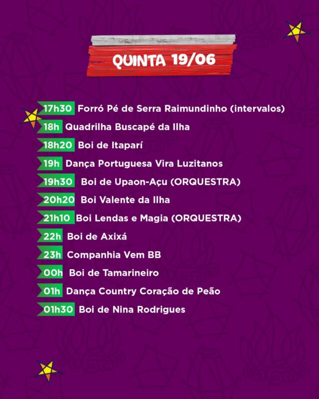 A programação terá início todos os dias às 17h30. No primeiro dia de festa, abrilhantarão o terreiro o melhor do forró pé de serra, seguido pela quadrilha Buscapé da Ilha, Bumba-Meu-Boi D’Itaparí, dança portuguesa Vira Luzitanos e Boi de Upaon-Açu. Logo depois, se apresentarão os bois Valente da Ilha, Lendas e Magia e Axixá, seguido pela Companhia Vem BB, Boi de Tamarineiro e dança country Coração de Peão. O encerramento será com o Boi de Nina Rodrigues.