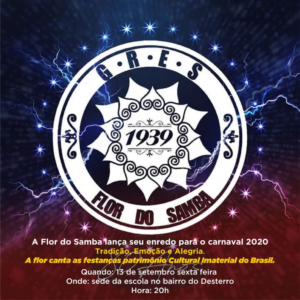O Grêmio Recreativo Escola de Samba Flor Samba apresenta o enredo para o carnaval de 2020. O coquetel de lançamento vai acontecer nesta sexta-feira, dia 13 de setembro, na sede da escola, no Desterro, por volta das 20h, com a presença da imprensa e de convidados do mundo do samba.