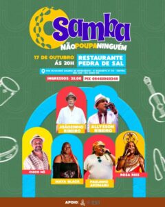 GeralHoje, 17, tem o Samba não Poupa Ninguém, às 20h, no Restaurante Pedra de Sal. Veja esses e outros destaques! 17/10/202517/10/2025 s