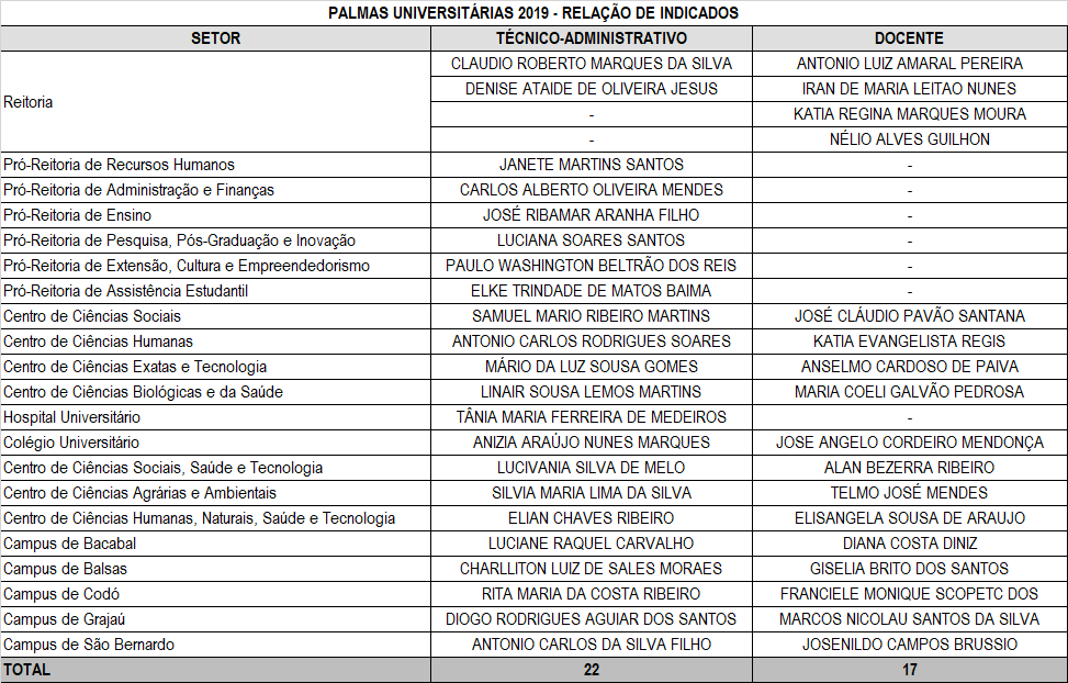 As Palmas Universitárias serão entregue pela reitora Nair Portela a 39 pessoas, entre professores e técnicos da UFMA. O processo de escolha das personalidades homenageadas é amplo e democrático e tem início nas Unidades Acadêmicas e Administrativas.