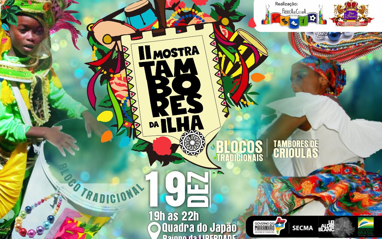 O sábado, 19 de dezembro, a partir das 19h, na quadra do Japão, na Liberdade  será palco da II Mostra Tambores da Ilha, mais um importante acontecimento cultural, que só vai ratificar a rica diversidade cultural do maranhense  e força do nosso balaio de ritmos, que em uma  só noite os tambores vão rufar mais fortes, com  passagens de grupos de Blocos Tradicionais e Tambores de Crioulas. O evento tem apoio do Governo do Estado, por meio da Secretaria de Cultura e da Lei Aldir Blanc. E para ter acesso ao local só com uso obrigatório de máscaras obedecendo ao protocolo de saúde por conta da pandemia do COVID 19.