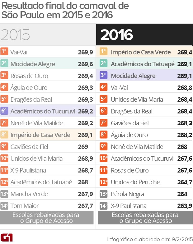 Foram rebaixadas a Pérola Negra e a X-9 Paulistana. A Pérola negra, que voltou à elite do carnaval neste ano, cantou e dançou o bairro da Vila Madalena. Já a X-9 fez uma homenagem a Belém e ao açaí, fruta típica do Pará.