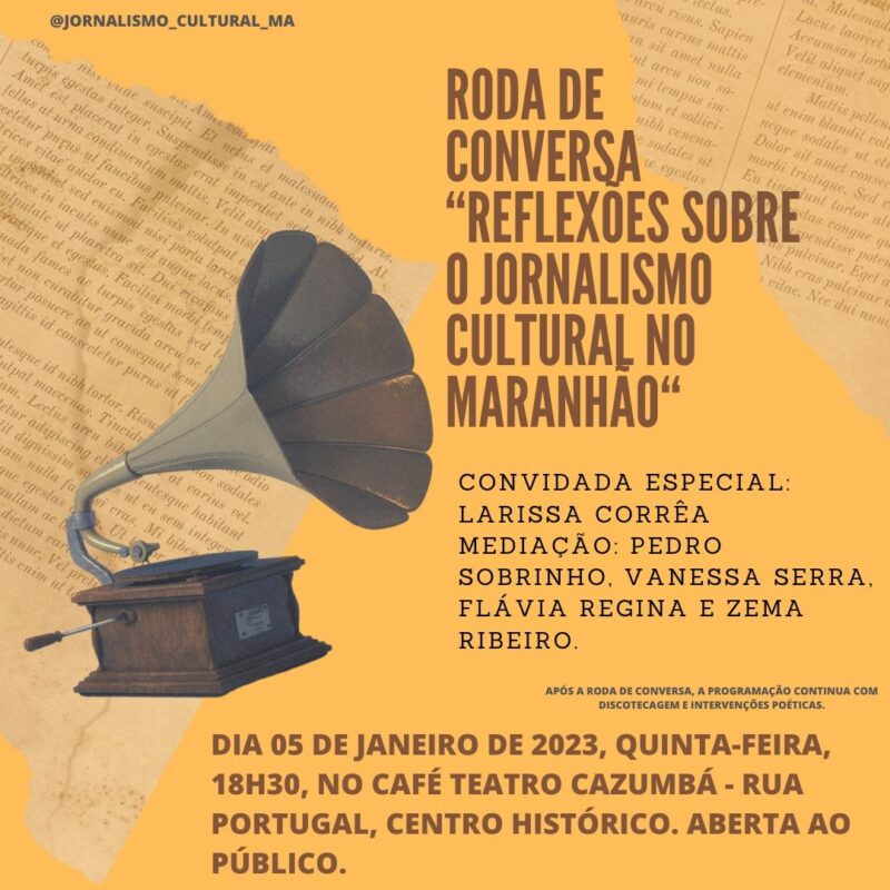 Nesta sexta-feira (05/01), a partir das 18h30, ocorre roda de conversa com o tema: ‘JORNALISMO CULTURAL NO MARANHÃO, REFLEXÃO E IMPORTÂNCIA EM TEMPOS DE MUDANÇAS’, no Café Teatro Cazumbá- Rua Portugal, Praia Grande. O acesso é liberado.