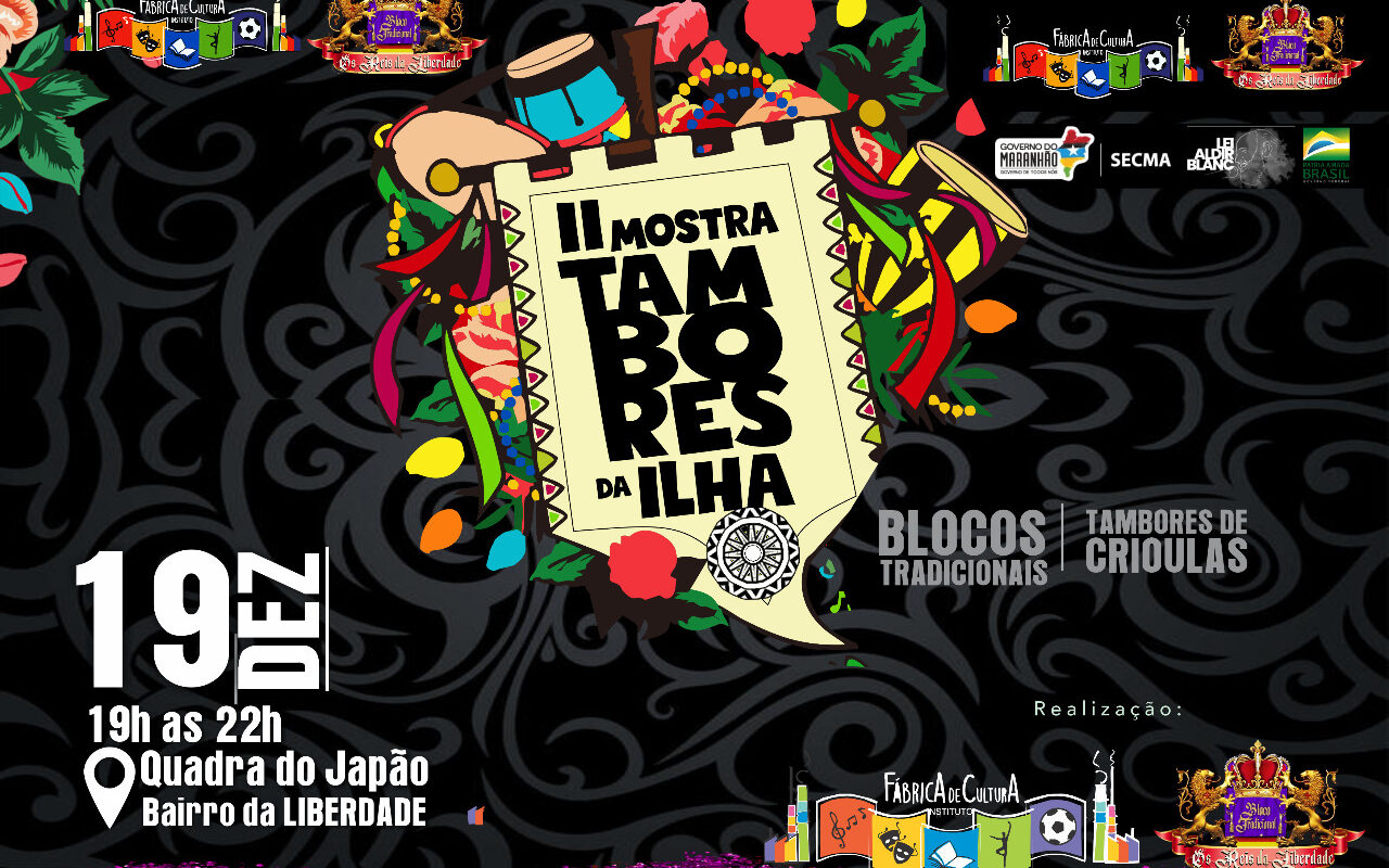 Reconhecido pela Fundação Cultural Palmares como o primeiro quilombo urbano do Maranhão, o bairro da Liberdade, em São Luís/MA, sediará a II Mostra Tambores da Ilha neste sábado, 19 de dezembro, às 19h, na Quadra do Japão. Com apoio cultural da Lei Aldir Blanc, por meio dos governos federal e estadual, via Secretária de Cultura, a mostra reunirá apresentações de blocos tradicionais e grupos de tambor de crioula.