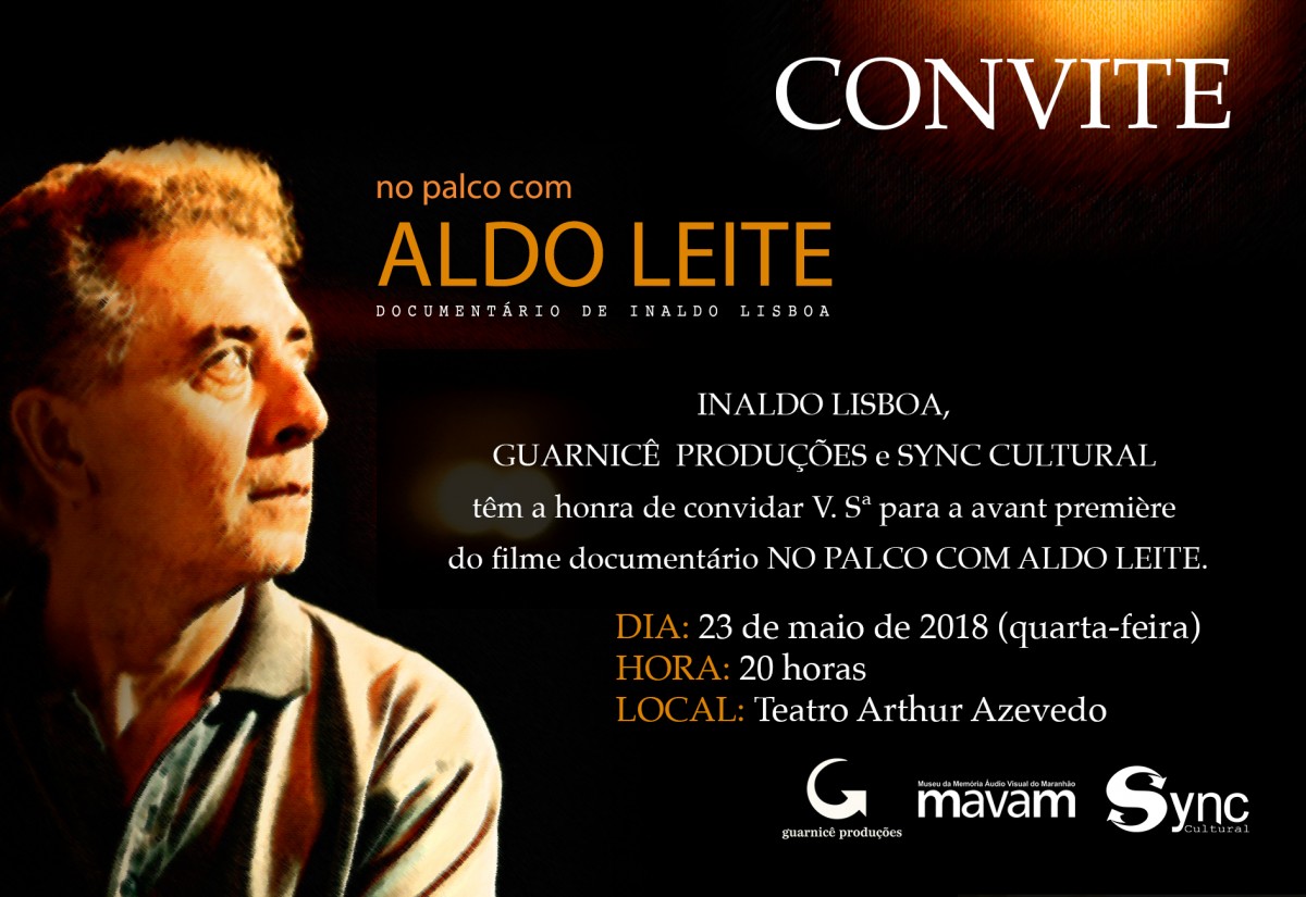 Nesta quarta-feira, dia 23 de maio tem estreia nacional no palco do Teatro Arthur Azevedo, o documentário em longa metragem NO PALCO COM ALDO LEITE, filme que foi rodado em 2016, em São Luís/MA, com Roteiro e Direção de Inaldo Lisboa, produção Inaldo Lisboa, Guarnicê Produções, MAVAM e SYNC CULTURAL, Direção de Fotografia Evandro Martin, Direção de Som, Montagem e Edição Edemar Miqueta, Assistência de Direção, Edemar Miqueta e Lio Ribeiro e Assistência de Produção Charles Melo.