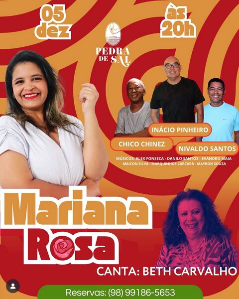 Em celebração ao Dia Nacional do Samba, com data em 02 de dezembro, a talentosa cantora Mariana Rosa, da Companhia Barrica traz para o palco o show “Mariana Rosa Canta Beth Carvalho”, no dia 5 de dezembro, às 20h, para uma noite de puro samba e emoção. O evento será realizado no Pedra de Sal, na R. Nazareth, nº 173 – Centro, São Luís, com participação de Inácio Pinheiro, Chico Chinês e Nivaldo Santos e acompanhamento musical de Alex Fonseca, Danilo Santos, Evandro Maia, Maicon Silva, Marquinhos Carcará e Mayron Souza.