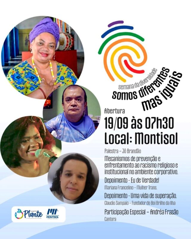 A recepção aos convidados, imprensa e colaboradores acontecerá das 7h30 às 7h35, com o coordenador Fernando Braga. Das 7h35 às 7h38, ocorrerá o Momento Música, com Andréa Frazão. Em seguida, o diretor executivo da empresa, Fernando Lima, apresentará o tema “Diversidade na Montisol”, das 7h38 às 7h41. Logo após, a professora e pesquisadora Jô Brandão apresentará a palestra “Mecanismos de prevenção e enfrentamento ao racismo religioso e institucional no ambiente corporativo”, às 7h41, e em seguida haverá momento musical com Andréa Frazão.