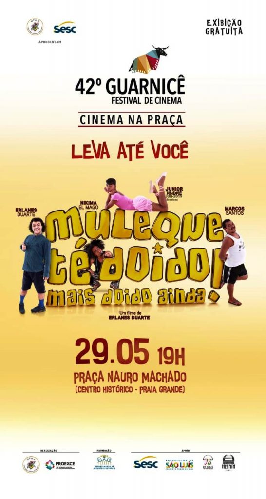 O divertido longa-metragem ‘Muleque Té Doido! Mais Doido Ainda!’, dirigido pelo cineasta Erlanes Duarte, terá exibição gratuita’ nessa quarta-feira (29), às 19h, na Praça Nauro Machado, na Praia Grande, em São Luís/MA. Com apresentação da Universidade Federal do Maranhão (Ufma) e Serviço Social do Comércio (Sesc), a programação integra a ação promocional ‘Cinema na Praça’, que visa divulgar e formar plateias para o 42º Festival Guarnicê de Cinema, evento que acontecerá de 14 a 21 de junho/19, em São Luís/MA.