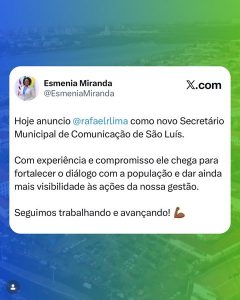 A prefeita Esmênia Miranda anunciou, na manhã de hoje, 27, o publicitário Rafael Lima como novo titular da Secretaria Municipal de Comunicação (Secom) de São Luís. A pasta volta a ter um ocupante fixo desde a saída de Igor Almeida, em dezembro de 2023. No período, a Secomzinha foi chefiada cumulativamente pelo supersecretário Emílio Murad (Semgov) e, mais recentemente, passou pela interinidade de Felipe dos Santos Lopes, adjunto da pasta. A nomeação do novo gestor cria expectativas positivas junto à imprensa e aos influenciadores digitais, radialistas, multimídias e blogueiros em ampliarem o diálogo profissional e institucional com a gestão municipal. É esperar pra ver!